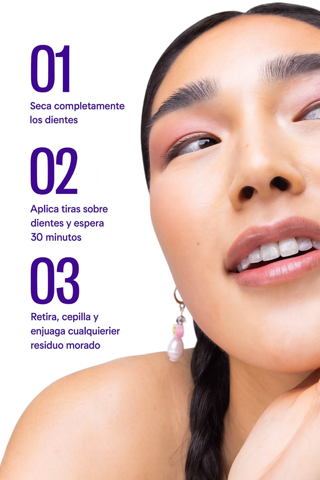 Cepilla tus dientes como de costumbre y sécalos suavemente con una toalla o pañuelo limpio. Aplica una tira en la arcada superior y otra en la inferior, presionando para que se adhieran bien a cada diente. Deja actuar durante 30 minutos sin comer ni beber. Pasado el tiempo, retira las tiras, cepilla o enjuaga tu boca para eliminar cualquier resto violeta y disfruta de una sonrisa más luminosa al instante.